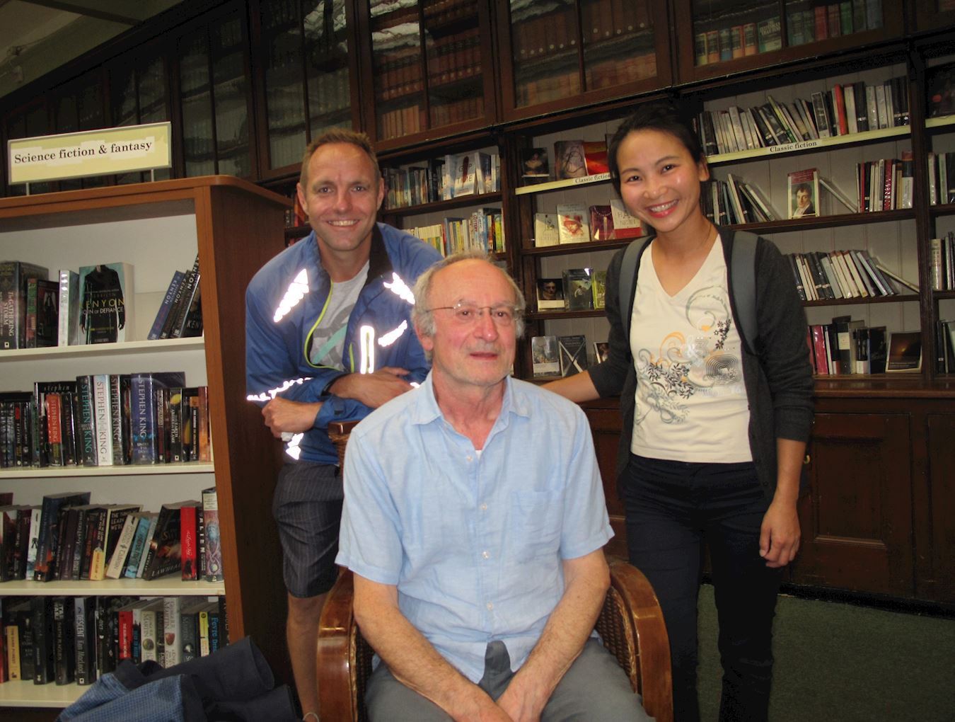 图3:二零一八年八月十八日,温布尔登图书馆法轮功义务教功班炼功结束后,法轮功学员温迪(Wendy,右)、斯科特(Scott,左)和阿尔贝托(Alberto,中)切磋交流炼功体会。