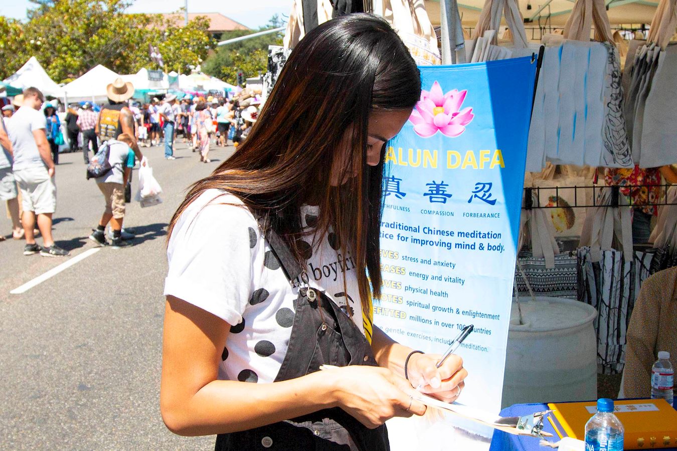 来艺术节购物的有不少中国大陆的移民和游客。他们看到法轮功学员的摊位,露出惊讶的表情,都驻足观看,有的高兴地接过真相传单。来自广东省的一对夫妇接过真相传单后表示,知道在江泽民掌权时,法轮功受到迫害,现在好象没有迫害了。学员告诉他们,中共对法轮功的迫害仍然在继续,只是中共控制的媒体很少报道这方面的内容。中共现在仍在迫害法轮功,并活摘法轮功学员的器官。他们很震惊,并感谢法轮功学员告诉他们真相。