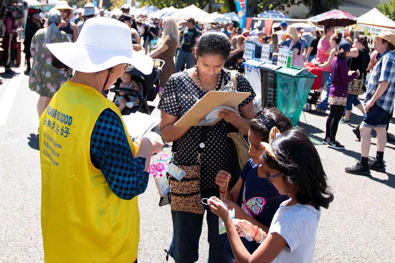 两天的佛利蒙艺术节每次都吸引几十万人。不少游客听到法轮功祥和的炼功音乐而驻足,有的还模仿法轮功学员的炼功动作,希望能进一步了解法轮功,