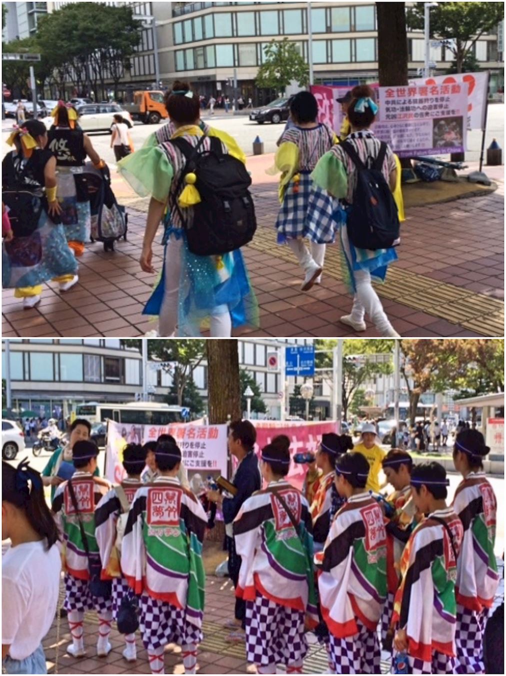 这两天,正好是日本最大规模的名古屋舞蹈节DOMATSURI举办日,活动期间过往行人与舞蹈表演的团体队伍络绎不绝。据日本媒体报道,今年的舞蹈节DOMATSURI从八月二十三日开幕,活动连续四天一直到二十六日晚结束,共有二百二十一万人参加和观看了舞蹈表演。