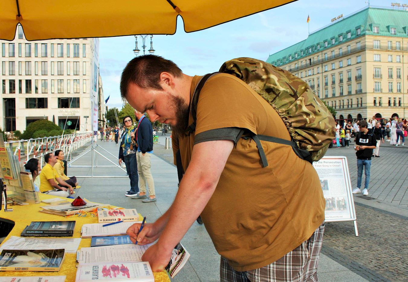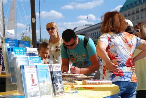 除了迫害事实外,一些游客还希望了解一下法轮功本身的特点,如何修炼及其带来的益处。法轮功学员们分享了他们自己的经历,并向人们发送了有关柏林炼功点信息的传单。