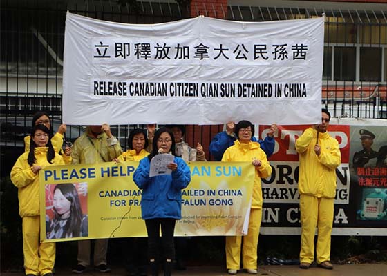 据加拿大公民孙茜家人透露,孙茜将于九月二十日,在北京被非法庭审。消息传出后,加拿大各地法轮功学员聚集在当地使领馆前和平抗议,要求立即释放孙茜。