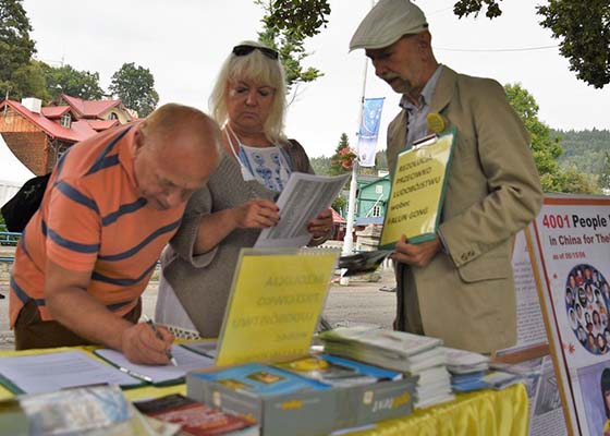 波兰法轮功学员们在东欧经济论坛会场附近的主要人行街道上摆放了近四十多米长的中、波、英三种文字展板,向参会的政要和过往民众介绍法轮大法。