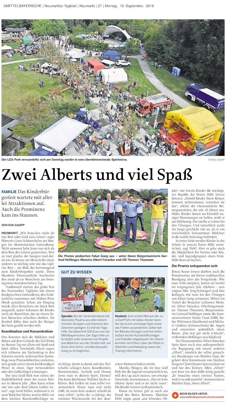 ![]() 图1-Mittelbayerische:诺马克日报报导儿童节,显著位置刊登嘉宾巴伐利亚州财政部长 Füracker,诺马克市长 Thumann和副市长 Heißlinger以及儿童节的主要赞助商学炼法轮功功法 |