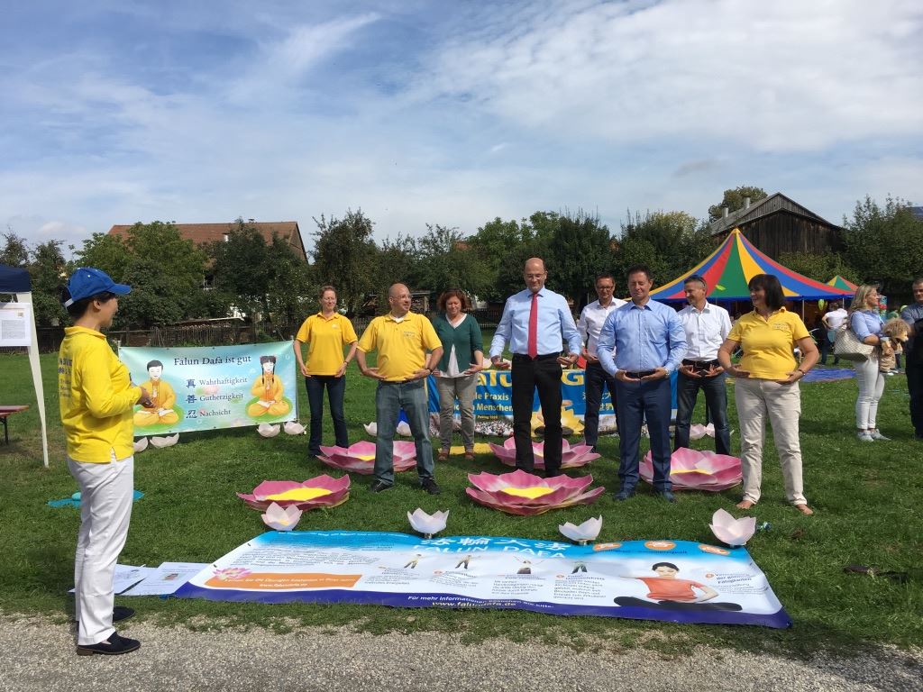 活动开始,法轮功学员先在展位旁演示了一到四套功法。炼第四套功法的时候,Neumarkt报社女主编Gaup把儿童节的嘉宾——巴伐利亚州财政部长 Füracker,诺马克市长 Thumann和副市长 Heißlinger以及儿童节的主要赞助商带到法轮功学员面前。法轮功学员随即邀请嘉宾一同炼功,嘉宾们欣然答应。尝试法轮功后,市长Thumann表示,他很欣赏亚洲文化,他相信这类功法对放松身心都是有益的。副市长Heißlinger说她炼法轮功的短短几分钟,什么也不想了,她感觉很好。报社主编现场拍下了嘉宾们和法轮功学员一起尝试第二套功法的照片。告别时,法轮功学员赠送给每位嘉宾手工制作的精美莲花留作纪念。
