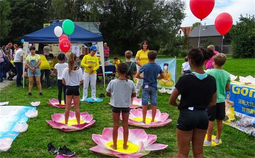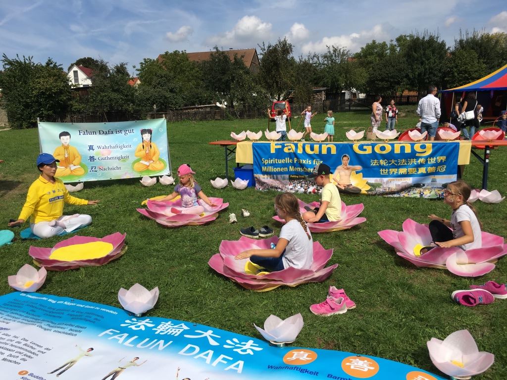 九月九日一早,巴伐利亚法轮功学员来到诺马克LGS公园参加一年一度巴伐利亚中部最大媒体集团Mittelbayerische Zeitung 主办的儿童节。活动前,报社已经给读者介绍了法轮功是中国古老的修炼身心的功法,孩子们炼功可以获得美好的感受。