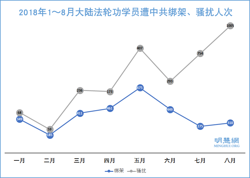 图2:2018年1~8月大陆法轮功学员遭中共绑架、骚扰人次
