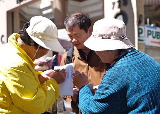 二零一八年的旧金山华埠中秋街会上,众多商家和团体云集。法轮功学员的摊位前常常车水马龙。学员们有的演示功法,有的忙着跟过往民众讲真相、劝三退。
