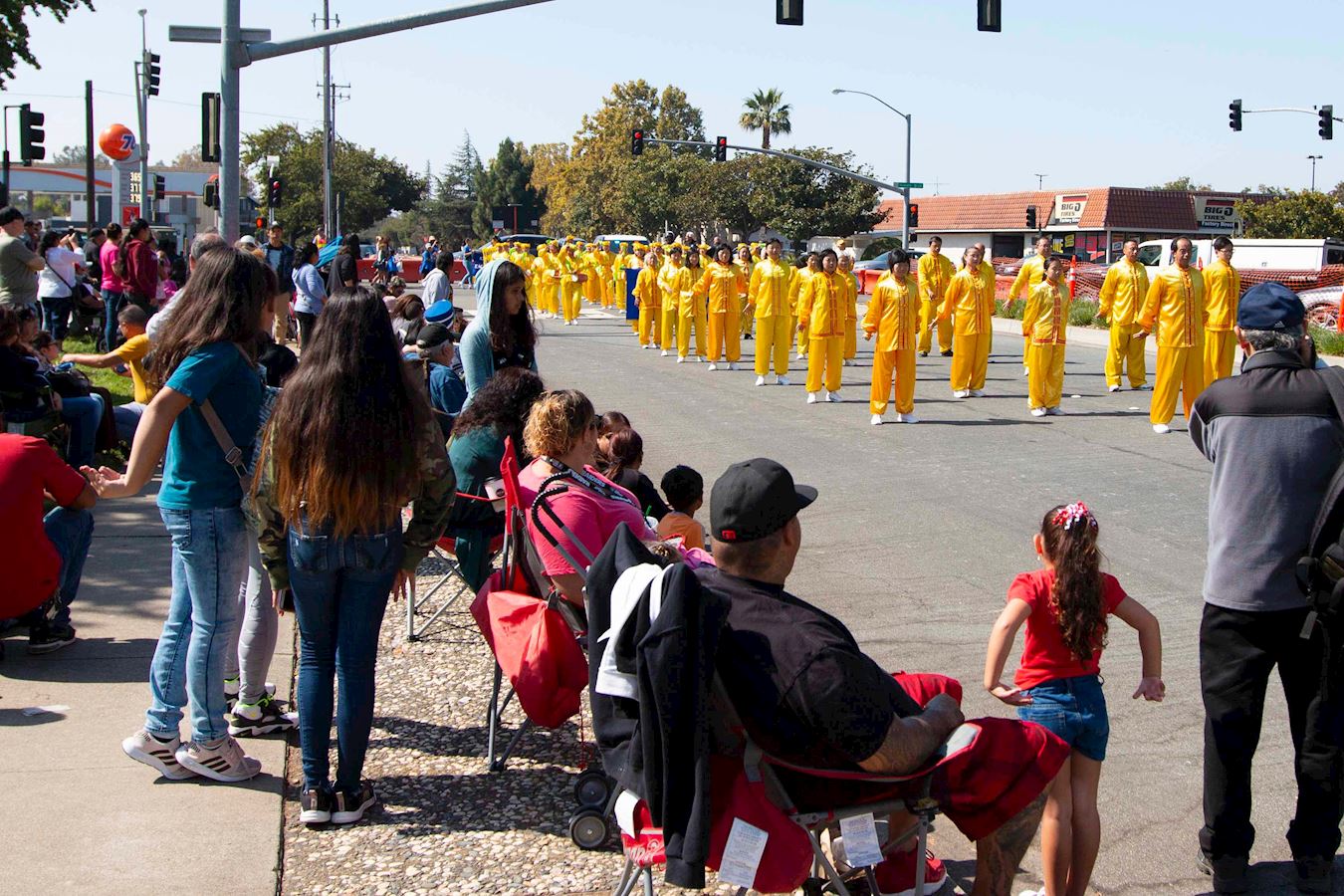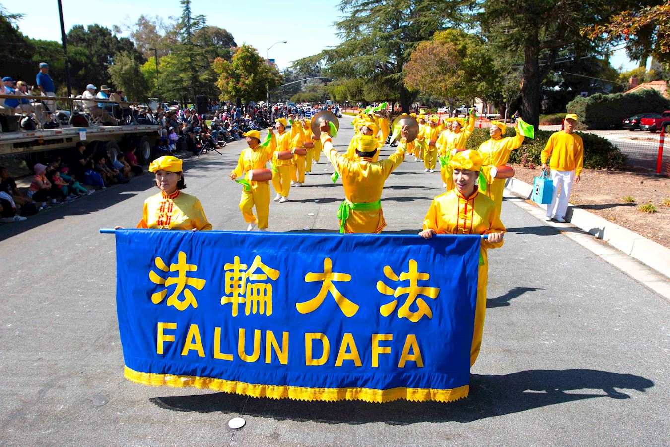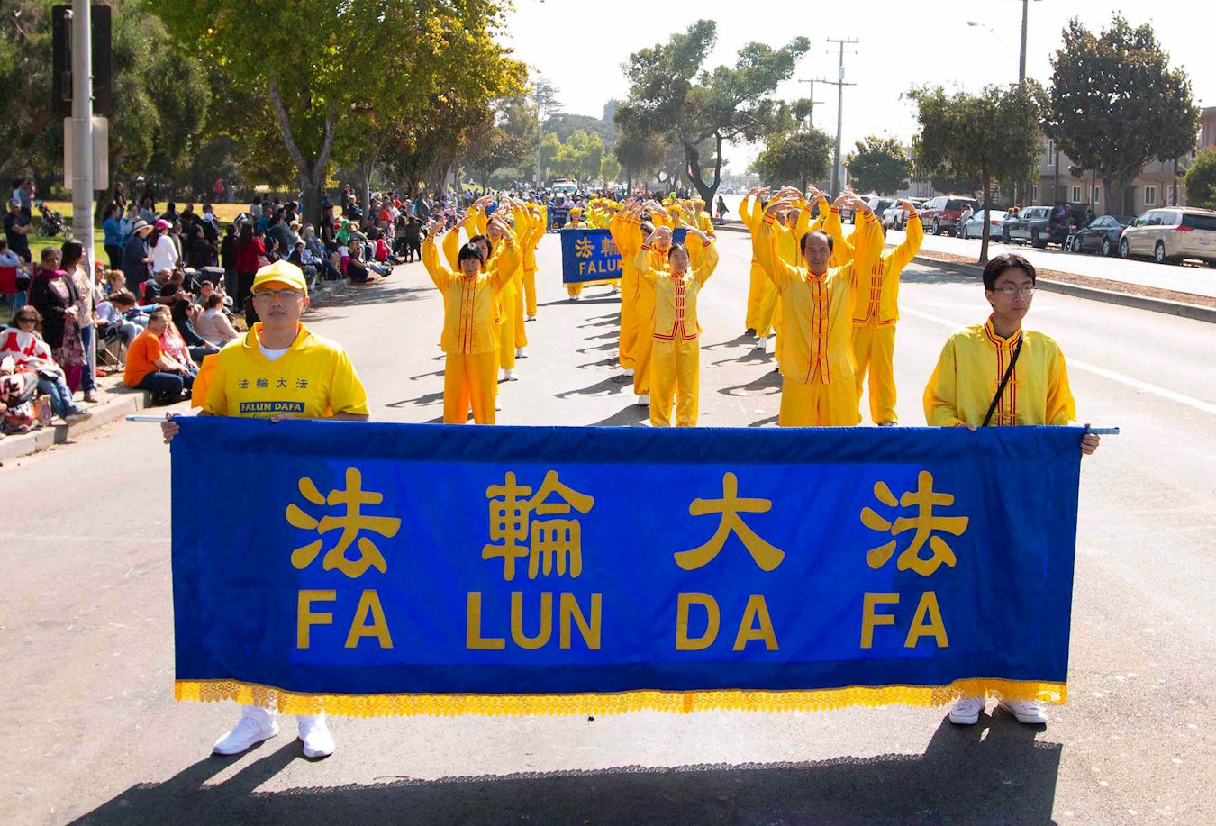 上午九点四十五分,游行开始。当身穿黄色炼功服的法轮功炼功队出现时,人们的眼睛为之一亮:这就是我要的,我喜欢他们缓慢的动作,我们需要放松,我们需要减缓压力。