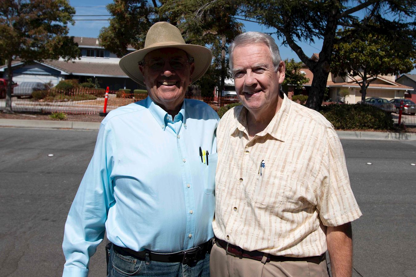 图7:七十二岁的游行评委大卫·史密斯(右)和评委爱德华·默尔对八十多岁的法轮功学员打着鼓走完全程感到惊叹