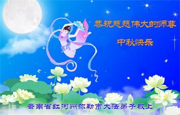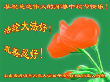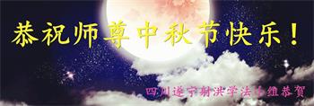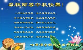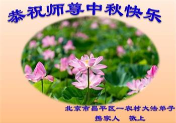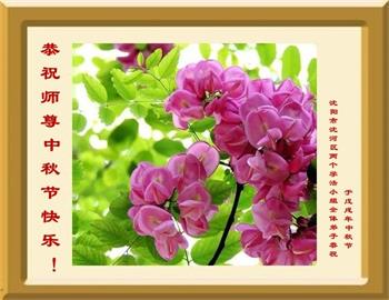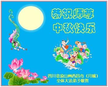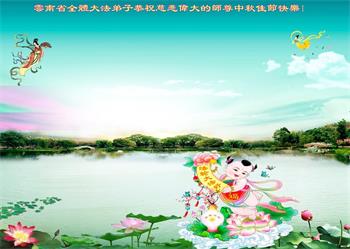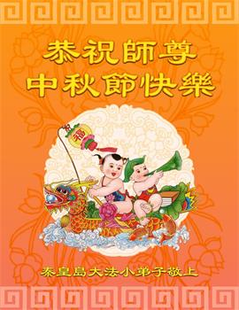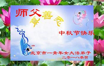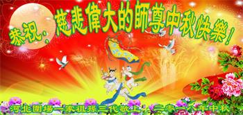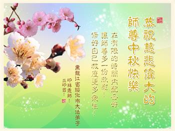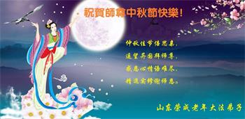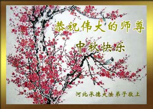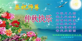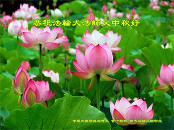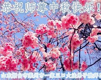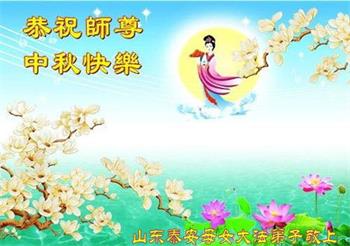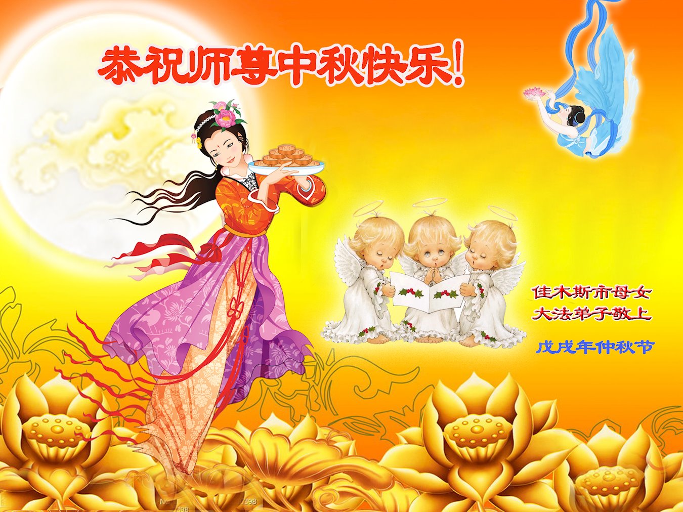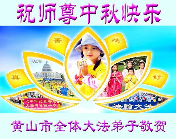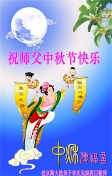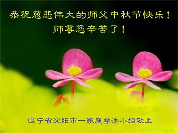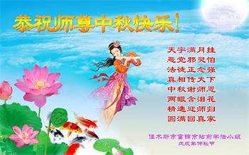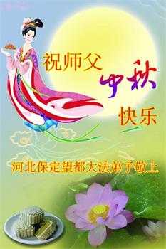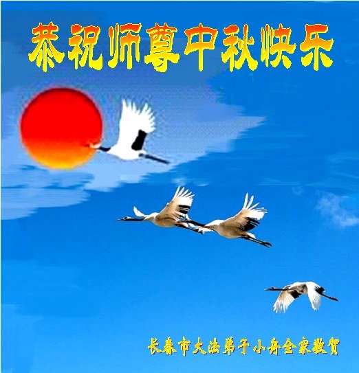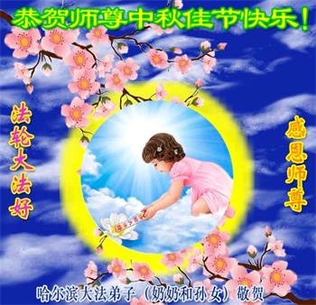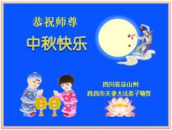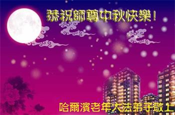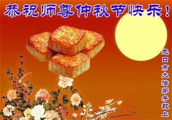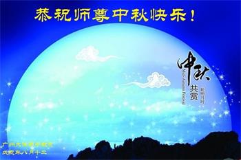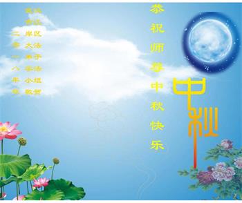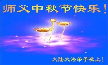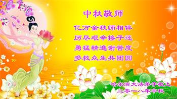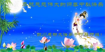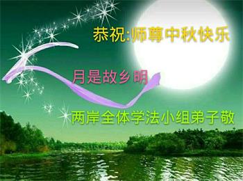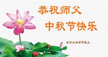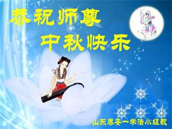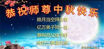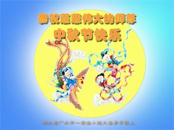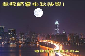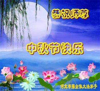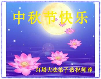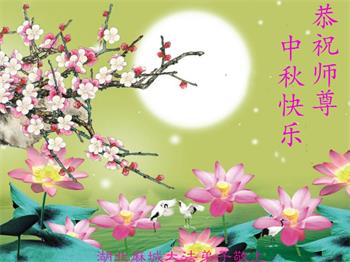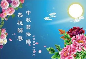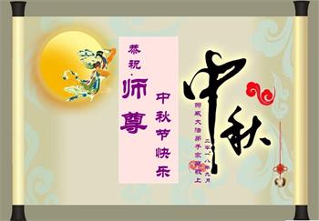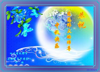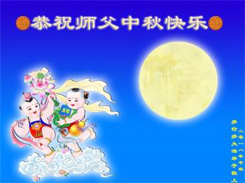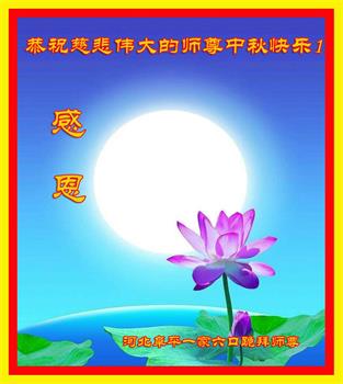 中秋佳节到来了,弟子恭贺师父佳节快乐!中秋是圆满的日子,弟子深深知道师父给予我们的法轮大法,能使我们修炼圆满。一些同修在大法中修炼勇猛精進,修成了,成为真正的大法徒,他们无愧师父的慈悲救度, 无愧于他们世界众生的期盼,他们的生命已经走向永恒。弟子惭愧,在目前师父的巨大承受下延长的修炼时间里,还不知道很珍惜,至今还有很多执着没有放下,没有修去,弟子希望能在今后的修炼中严格按法轮大法的要求去修炼,走向圆满。弟子无限感激师父的洪大慈悲救度之恩,在中秋佳节叩谢师父!,弟子给师父深深的敬合十礼!