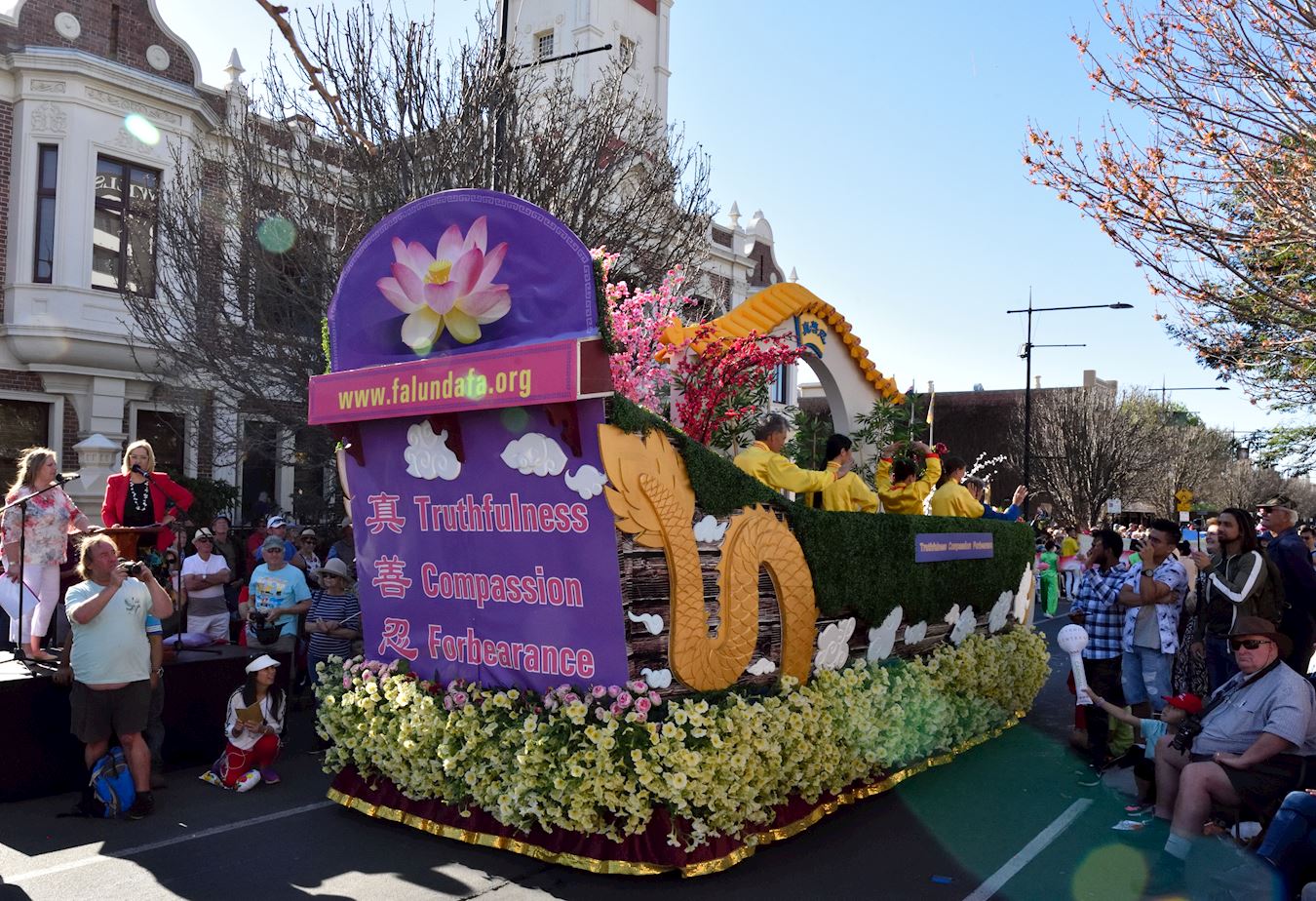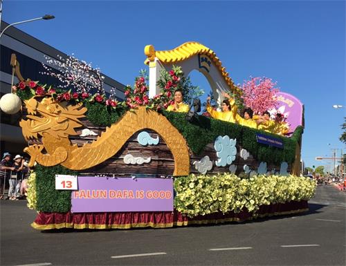 ![]() 图1:法轮功学员参加图文巴市第六十九届花卉嘉年华的花车大游行活动 |