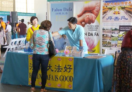一位先生告诉学员,他看到法轮功展位前人很多,就到别处去绕了一圈,然后回来签名支持法轮功反迫害。