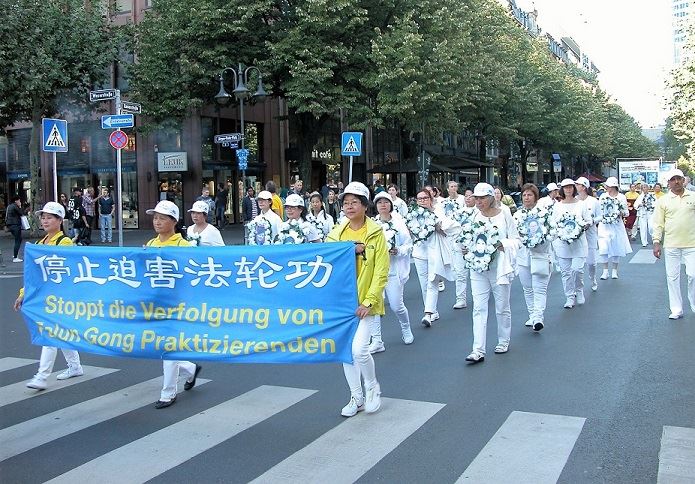 游行队伍由天国乐团,悼念方阵和真相横幅方阵组成。游行队伍从法兰克福繁华的商业步行街出发,经过著名的旧市政厅广场,法兰克福歌剧院直至市中心的火车站。学员们在市中心的两个真相点同时向民众征集支持反迫害的签名,并现场演示五套功法。本次活动吸引了很多民众的关注,许多当地居民向学员了解哪里可以学炼法轮功。