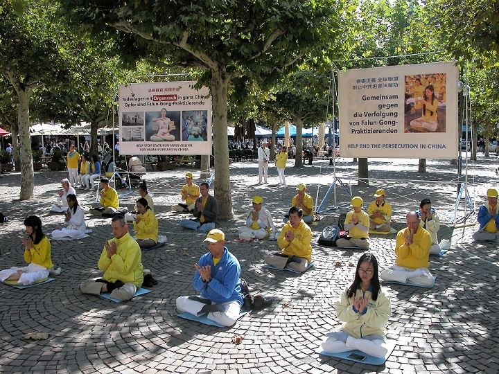 德国的法兰克福市是中国游客进出德国的最大口岸。活动当天天气晴朗,这个周末又正好是法兰克福的葡萄酒节,所以市中心不仅聚集了许多外国游客还比以往多了很多本地人。天国乐团的音乐,肃穆的白衣悼念队伍及浩浩荡荡的横幅队伍吸引了各国游客和当地市民驻足观看。