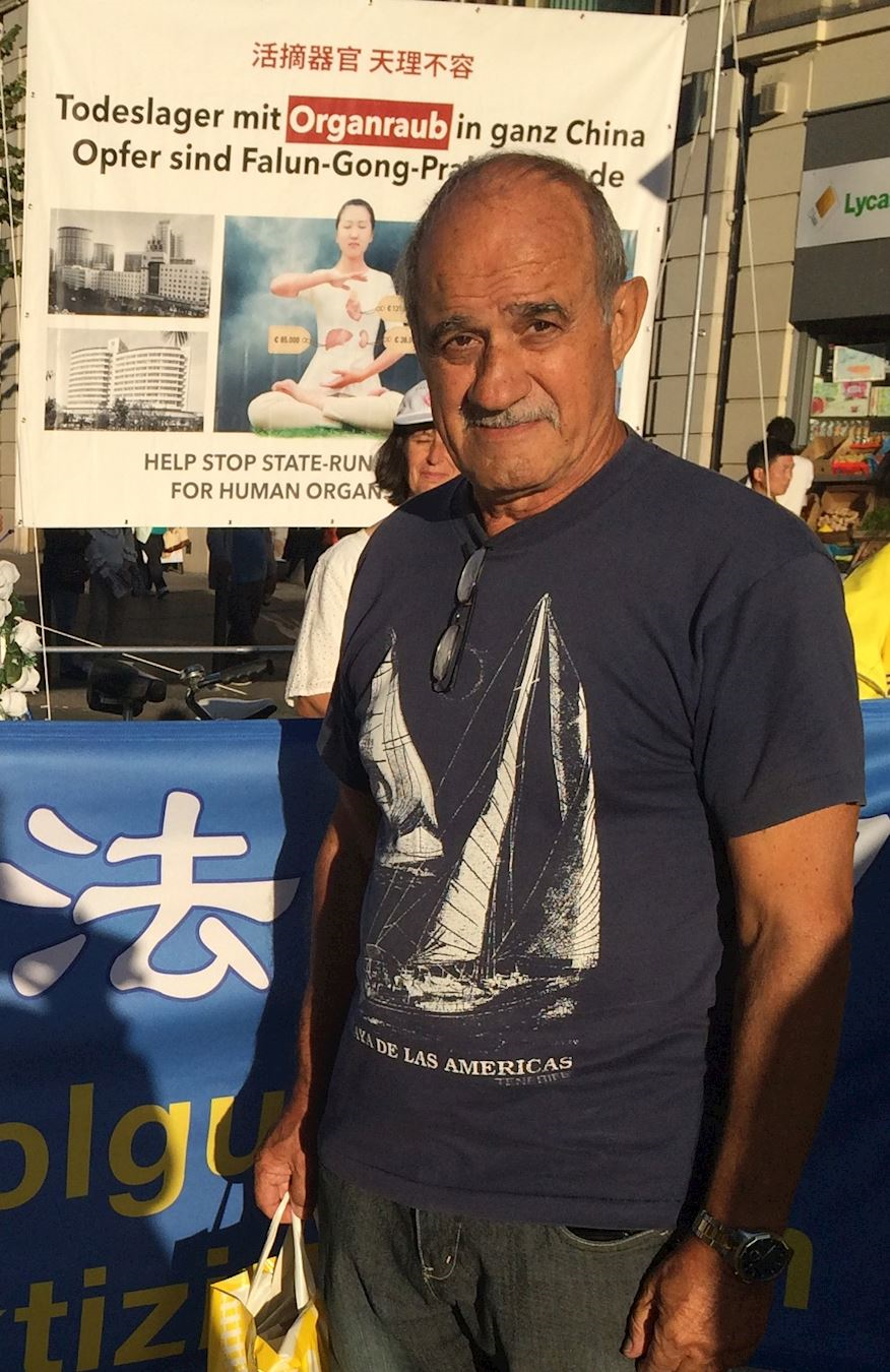 来自巴西一个慈善机构的创建人,马耳他居民约瑟夫(Josef),正好在德国待一周,碰到了法轮功学员的游行。他表示他觉得学员的游行队伍非常整齐有序,回去后,会更多的了解法轮功。对于中共的迫害,他表示:“我很惊讶,这样的事情在中国还在发生着。中国人民仍然没有我们这样的自由。中共是个独裁者。”