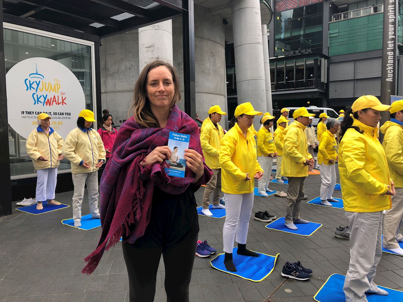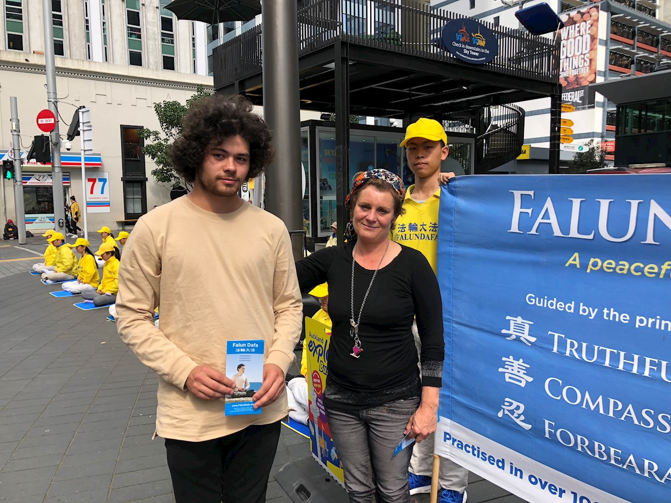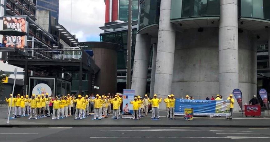 图1:法轮功学员在奥克兰天空城炼功、讲真相