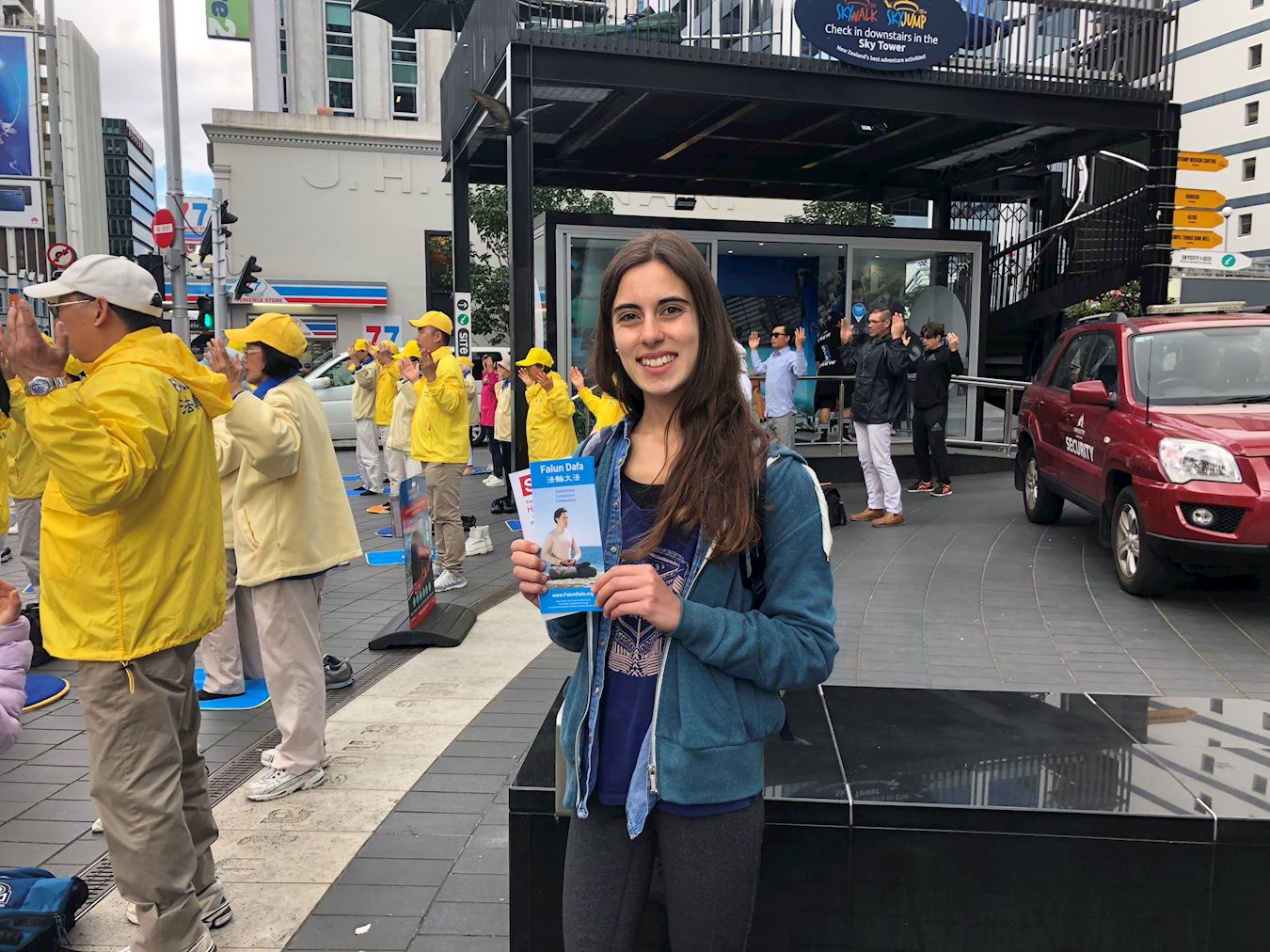 索菲(Sofie)今年十六岁,来自智利。她正在天空塔上观赏奥克兰美景,却被天空塔下面身着金黄色衣服的人群所吸引,所以下塔后,便主动上前来了解法轮功。她非常好奇,因为在她看来,在人群嘈杂的地方打坐是很难入静的,她很惊叹也很敬佩法轮功学员。她说,精神心灵的健康是身体健康的关键,其实每个人都应该打坐,但事实上在这个世界上没有几个人能真正静得下来的。对于中共的迫害,她不解地问:“是不是因为法轮功学员们的平和与良好的生活方式以及心灵的满足,引起了中共的妒嫉?因为他们自己做不到。”