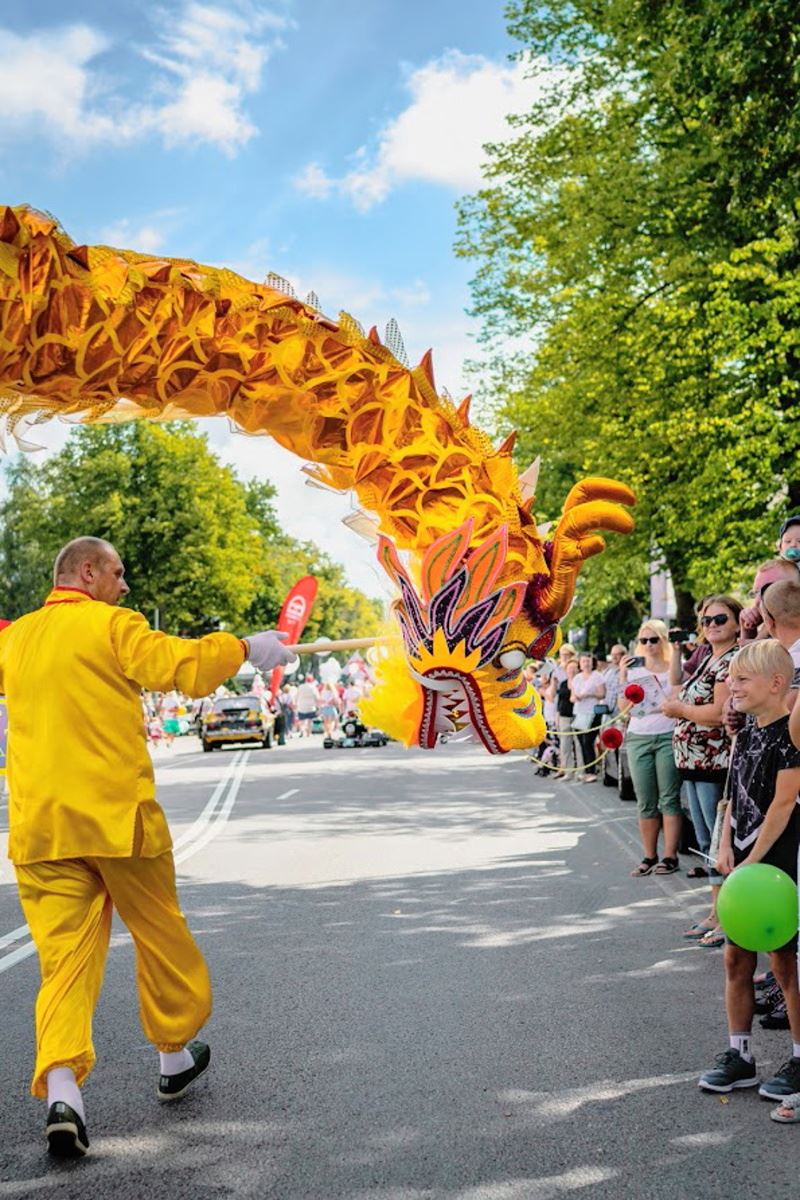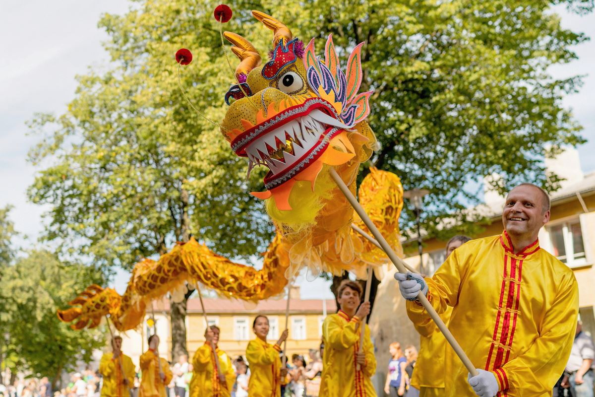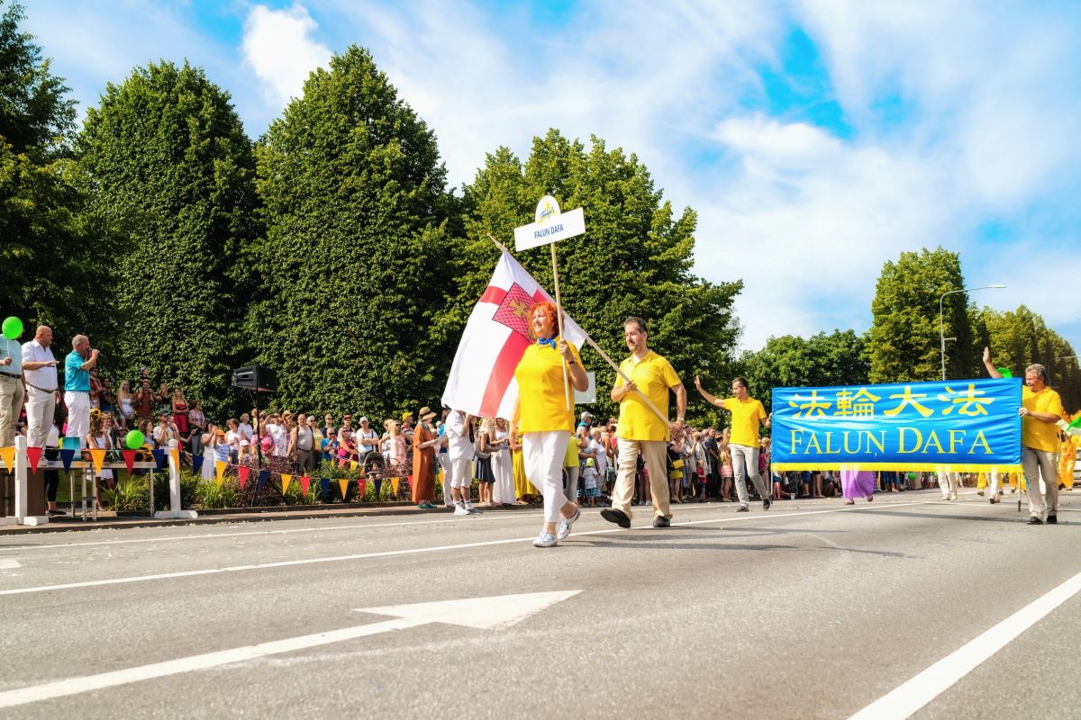 八月四日,来自拉脱维亚不同城市的法轮功学员,还有从国外赶来支援的法轮功学员参加了游行。五名法轮功学员在花车上向民众演展着法轮功的五套功法。今年,法轮功学员的舞龙队首次参加了游行,获得观众的喜爱。民众高兴地举起相机拍照。
