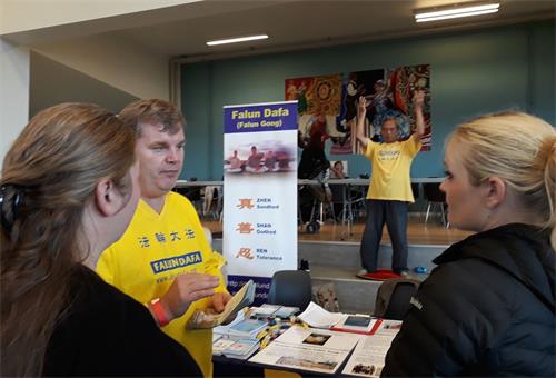 ![]() 图5:格蕾特(Grete)女士(左)对法轮功感兴趣,很赞同真善忍理念。 |