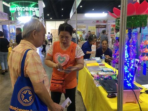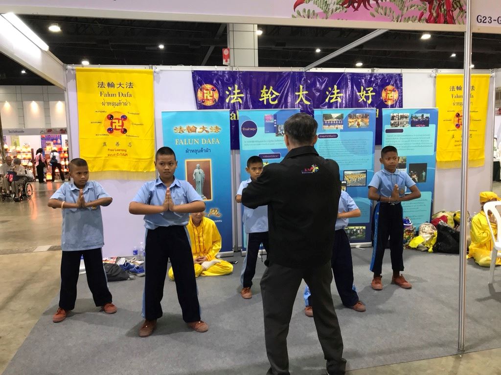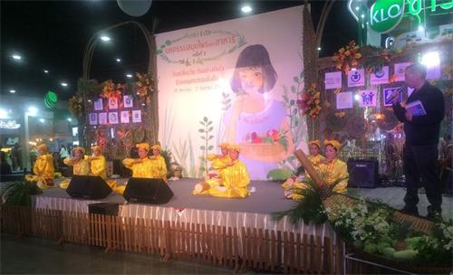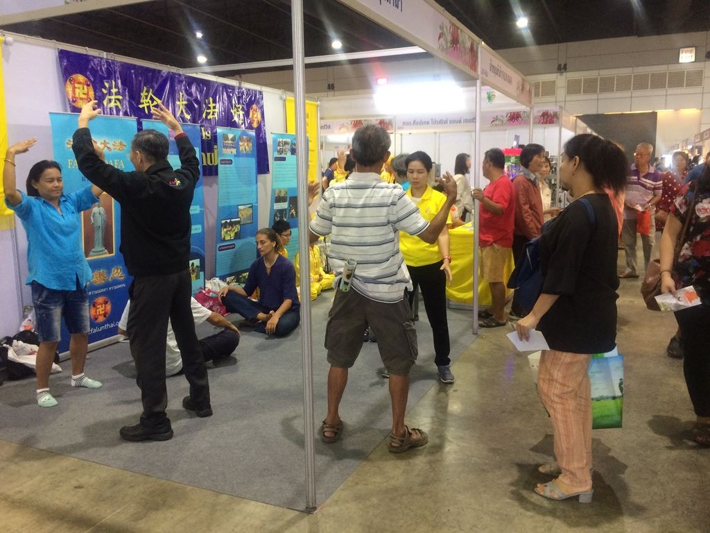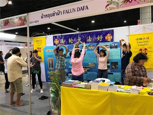展会中,泰国法轮功学员不但在展位发资料、教功,而且在舞台上介绍功法,进行腰鼓队表演和功法演示,吸引了许多观众,腰鼓队的表演尤其气势雄壮、震撼人心,观赏的人们甚至有节奏的和着音乐、歌曲高喊“法轮大法好!”,情景感人。