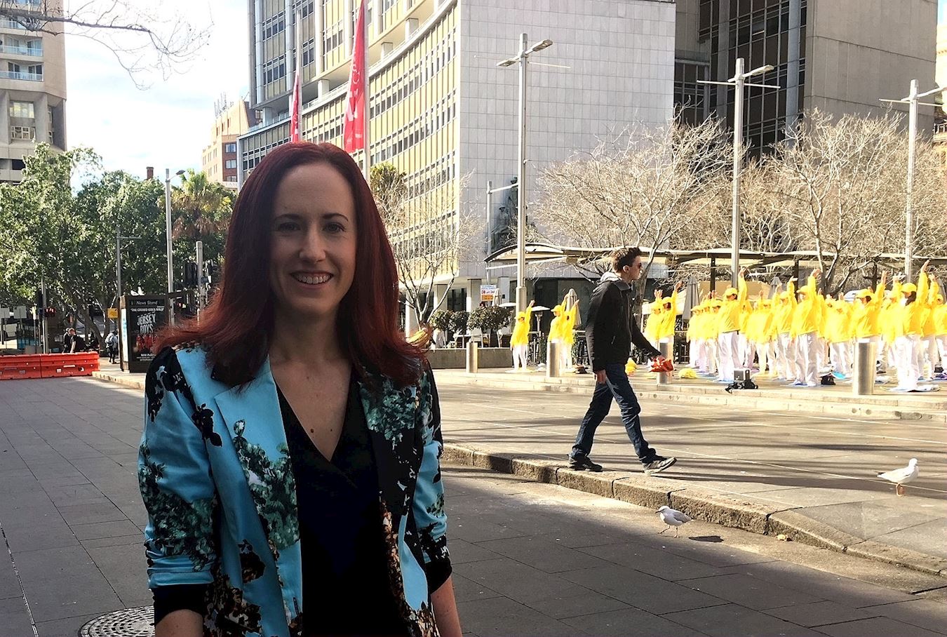 当天,金·特恩布里奇(Kim Tunbridge)女士如往常一样,从悉尼市中心环形码头的火车站出来,脚步匆匆,准备奔向公司上班,忽然对面一片明亮的金黄色身影吸引她停下脚步一探究竟,她面对上书着“法轮功是以真善忍为准则的修炼”的一条数米长横幅看着,然后对着炼功的人群和横幅拍了又拍。
