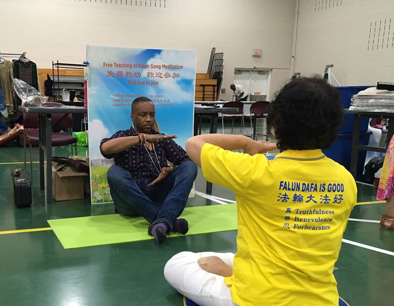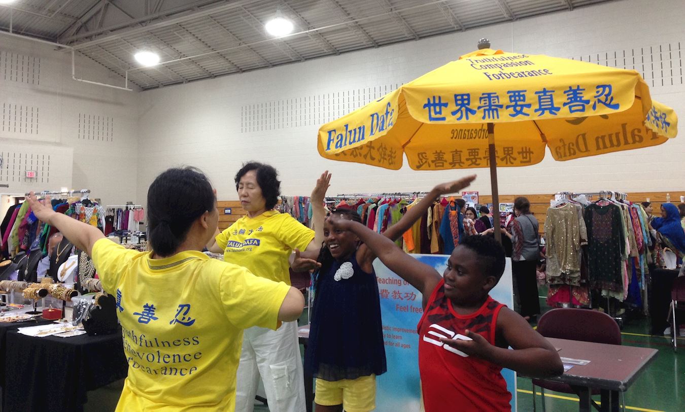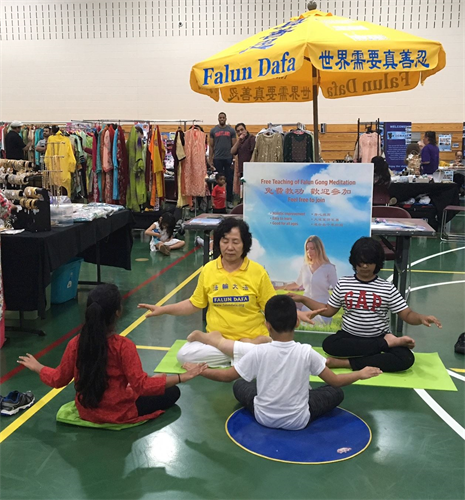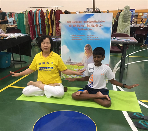 到了八点活动结束时间,别的摊位早就收了,来法轮功展位这儿学功的人还是一批又一批,最后来的是一位来自华盛顿特区的音乐老师,他已经是第二次来学了,还专门叫朋友把他学功的过程录像下来,非常认真。学完功后,他与学员交换了联系信息,说要请法轮功学员去他们学校教功。
