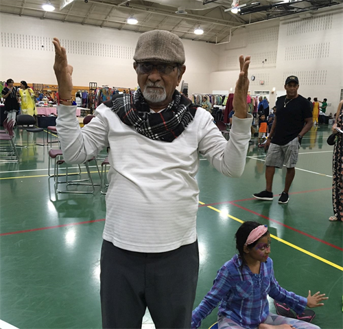 一家四口印度人路过,听了介绍后很感兴趣,问了当地炼功点的信息。年纪约七十岁的男士当场就想学功,才学了第一套,就感叹说他感觉上了天堂,学完第二套,他说感觉法轮功学员们象他的亲人一样亲切。