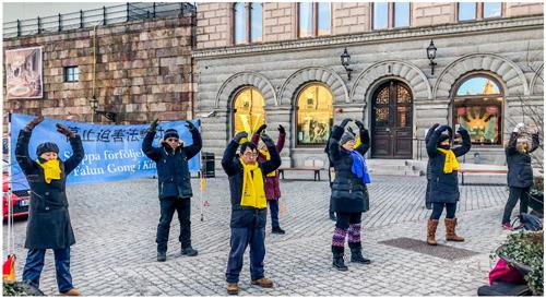 这是发生在瑞典首都斯德哥尔摩通往老城、最热闹皇宫旁的钱币广场上的一幕,二零一九年一月十二日周六下午,尽管天气寒冷,法轮功学员和往常一样,竖起“停止迫害法轮功”的横幅、摆上真相展板,伴随着优美的音乐展示法轮功的五套功法。很多人都被这宁静祥和的场面、法轮功学员坚韧不屈的信念所感动,主动上前观看真相展板、了解法轮功真相。
