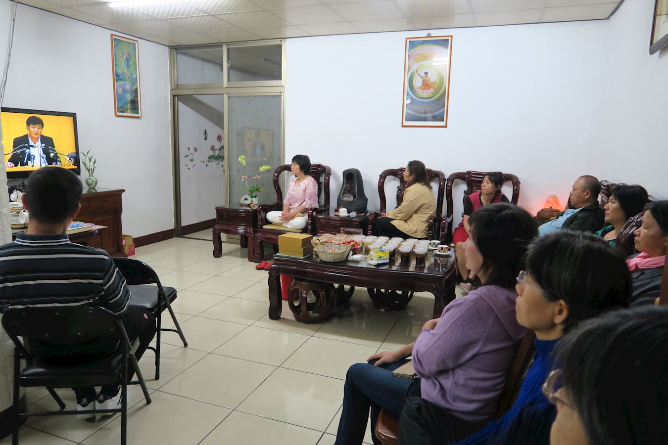图1:台中市大里区的法轮功学员举办九天学习班,新学员们一起观看师父的讲法录像。
