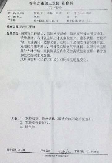 秦皇岛市第三医院是专治传染病的医院。杨金霞在这里做的两次CT检查,二零一八年十月十一日的结果是 “现片与前片(二零一七年五月二十七日)相比未见明显变化”。