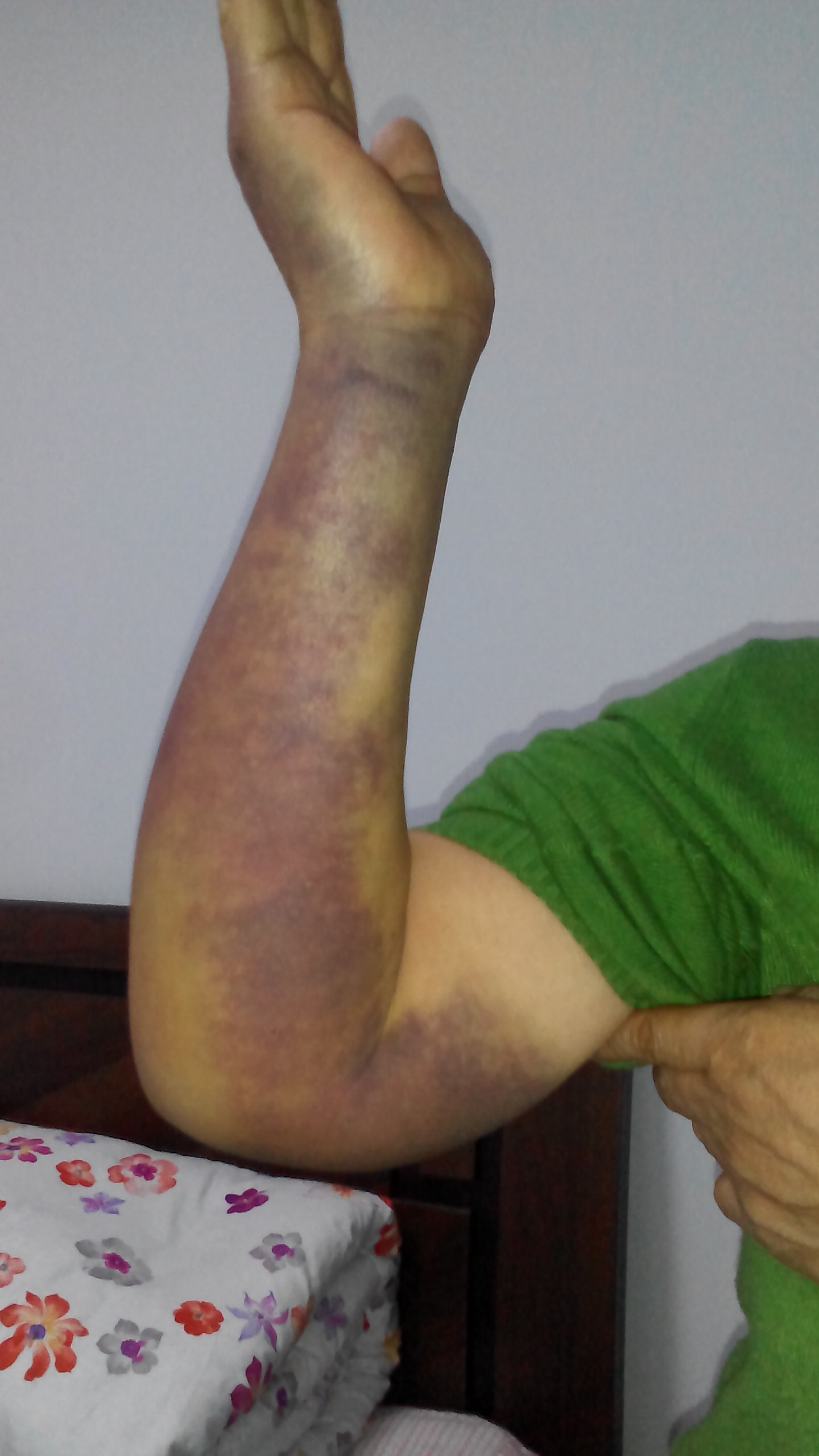 高国庆的妻子上前阻拦,被两个警察按倒在地,胳膊严重扭伤,侧臂鹰嘴骨折,疼痛难忍,医生说现在急需手术治疗,否则会造成终身残疾。