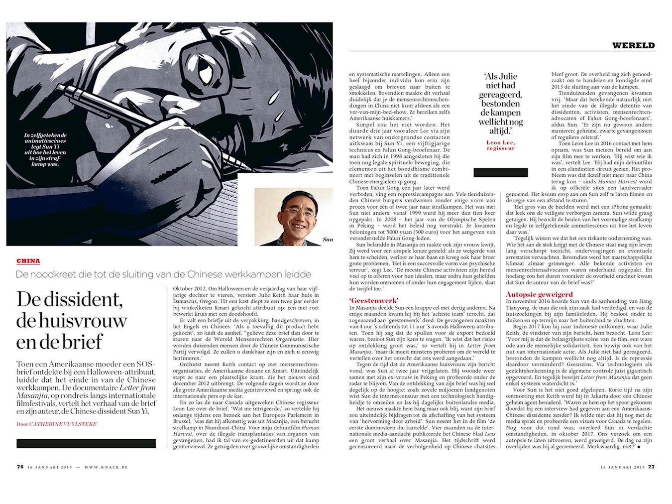 【明慧网二零一九年一月十九日】(明慧记者容法编译报道)二零一九年一月十六日,比利时佛拉芒语每周新闻杂志《诀窍》(Knack),刊登了一篇文章。文中详尽报道了获奖影片《求救信》中主人翁——法轮功修炼者孙毅,因坚持信仰惨遭中共迫害的遭遇。