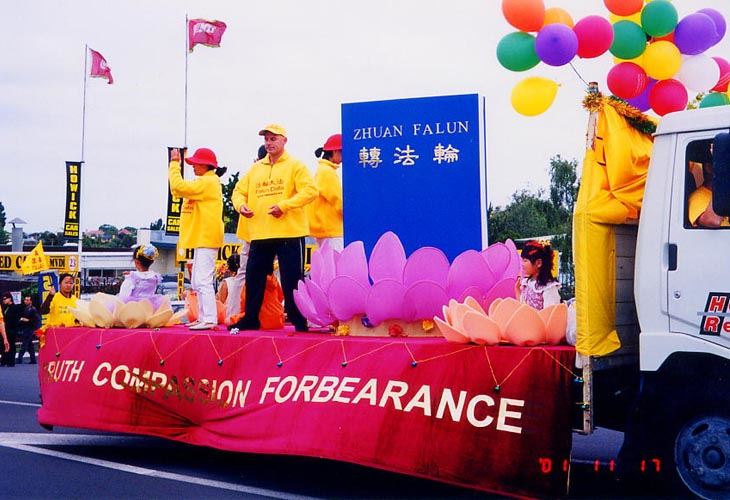 ![]() 图5:二零零一年十一月十七日,新西兰奥克兰的法轮功学员在东区的赫威克(HOWICK)参加了一年一度的圣诞游行。图为游行花车和花车上的《转法轮》模型。 |