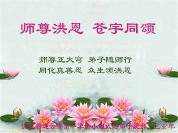 “感恩李大师的救度,派天使送给我一张‘翻墙’的光盘,使我迷途找到了人生的方向,幸福可以传递,我会把真善忍的温暖告诉我的挚爱亲朋、告诉和我一样迷茫的邻里街坊,盼望李大师早日回国,恩泽众生,我们已经看到了新世纪的曙光!”