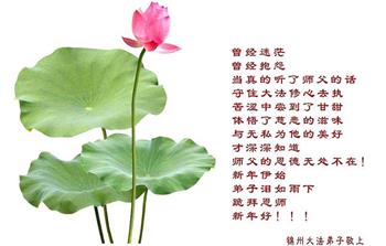 法轮大法自一九九二年传出,七年之内,修者上亿,祛病健身,道德回升。江泽民以小人之妒嫉,迫害法轮功,以谎言污蔑大法,欺骗世人。为了还原真相,自迫害之日起,大法弟子们不顾个人安危,以各种方式给世人讲大法真相,这与每个人的安危和未来切身相关。大法弟子讲真相迄今二十个年头,还在一如既往坚持。在中共的邪恶迫害中,中国大陆大法弟子们历经魔炼,在修炼中不断精進和成熟,表示新一年更精進,多救人。