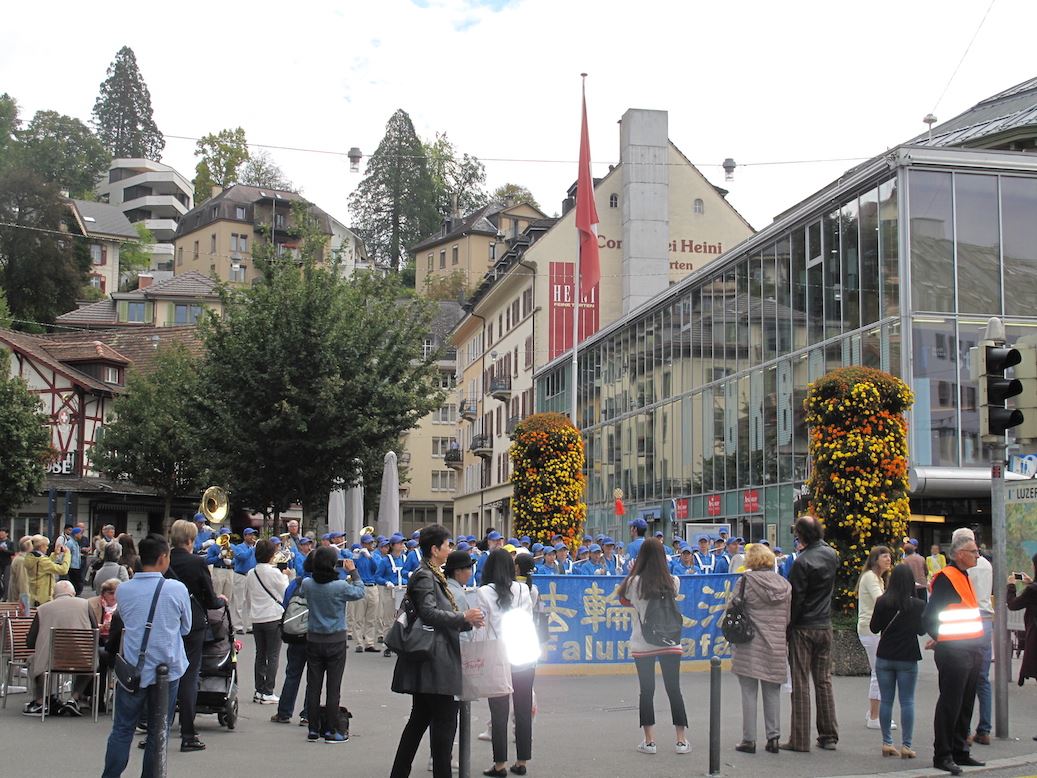 ![]() 二零一八年十月六日,“欧洲天国乐团” 在卢赛恩(Lucerne)狮子广场(Loewenplatz)演奏,吸引路人、游客。 |