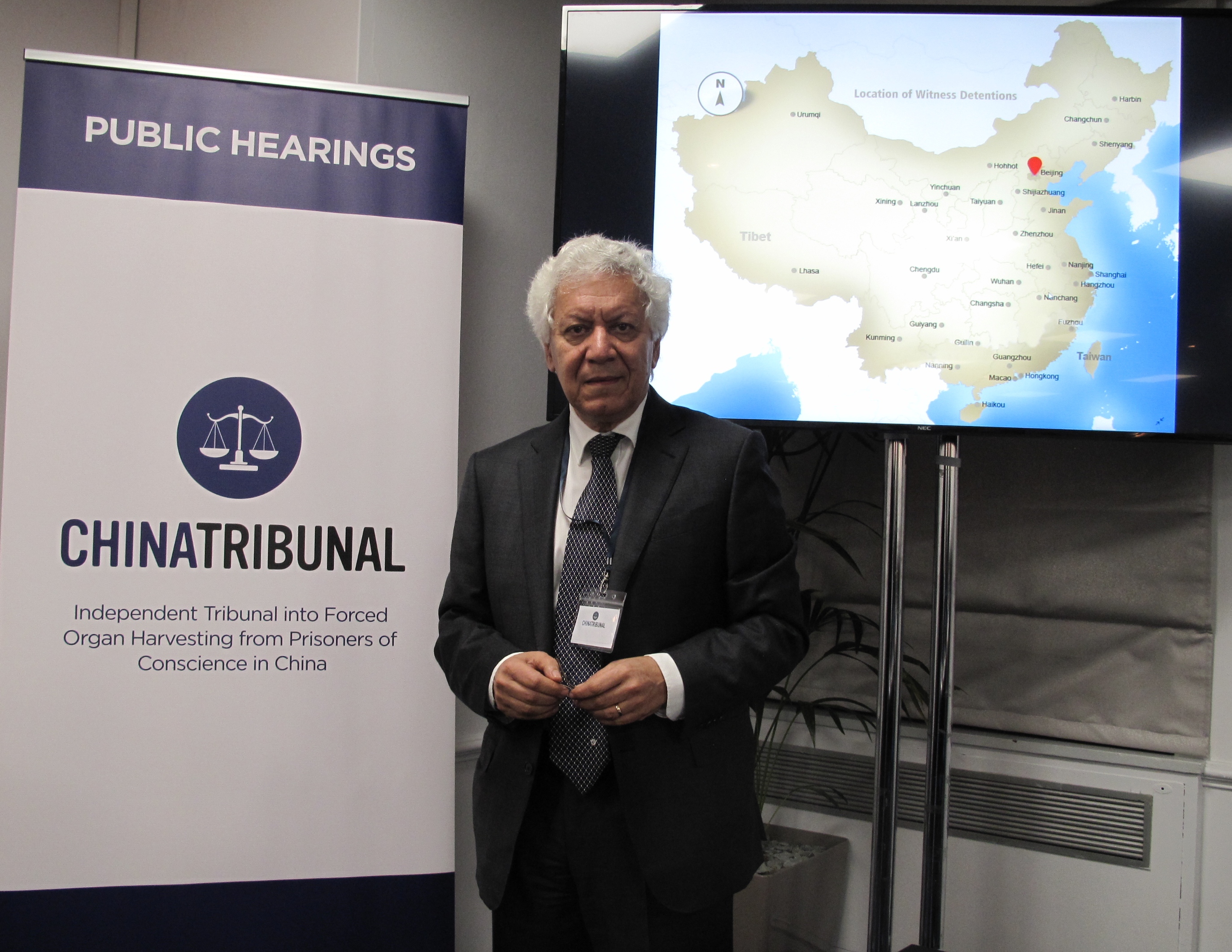 ![]() 图1:“独立人民法庭”(Independent People’s Tribunal/China Tribunal)主席、英国著名律师席杰弗里·尼斯爵士(Sir Geoffrey Nice QC)在独立法庭首次公开听证会结束时宣布暂定判决。 |