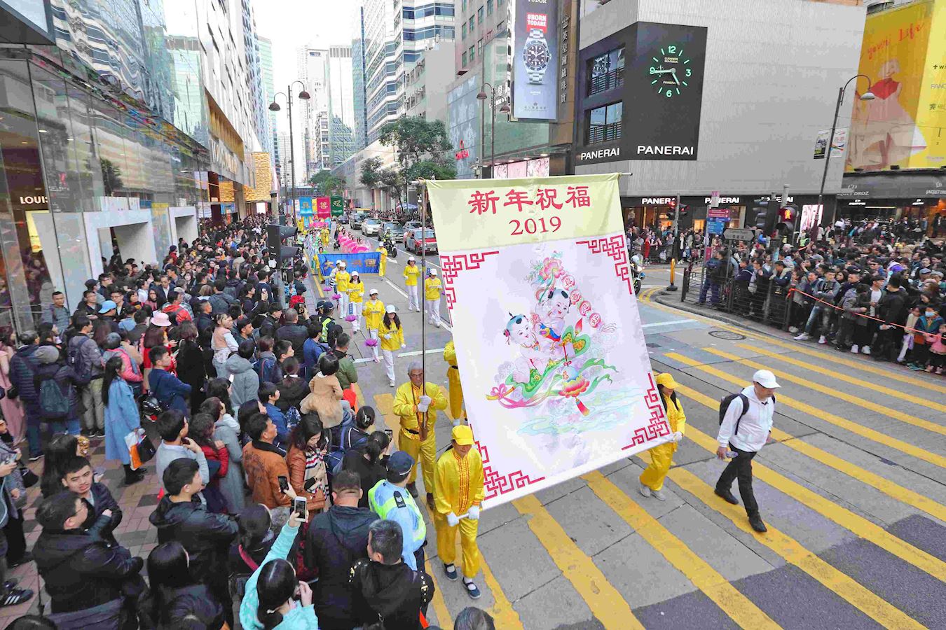 当天下午,法轮功学员在九龙区举行新年大游行,向民众传扬法轮大法的美好,送上新年的祝福。