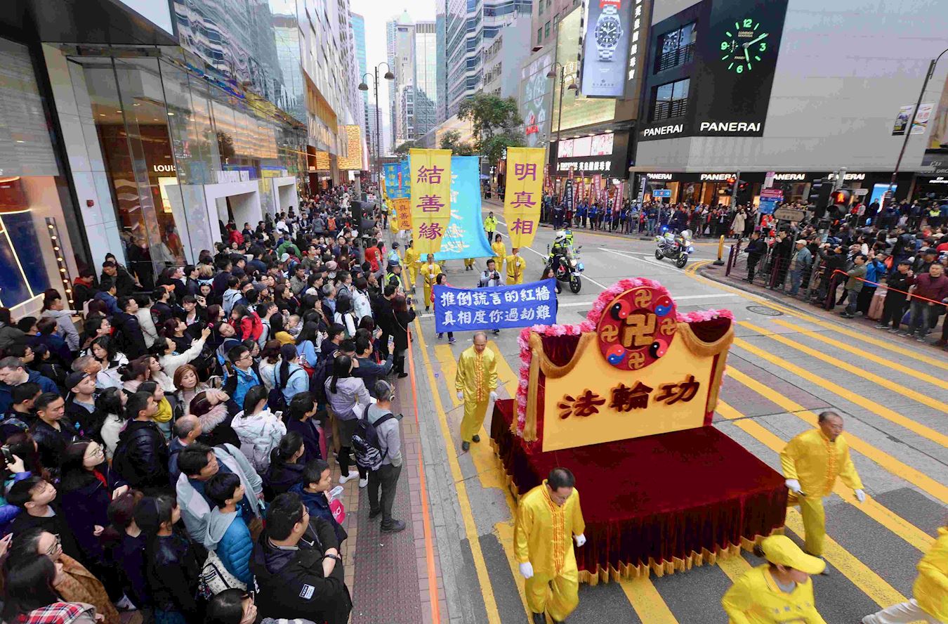 上午新年祝贺集会结束后,法轮功学员的游行队伍下午二时半从深水埗枫树街游乐场出发,在天国乐团雄壮的奏乐领头下,途经大陆游客购物热点旺角、佐敦,再进入尖沙咀广东道,到文化中心结束,历时近三个小时。沿途吸引成千上万的市民及中外游客观看,许多来港过新年的大陆游客纷纷拿出手机拍下游行的盛况。
