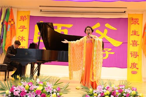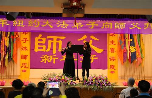 会场布置神圣、喜庆,“师父新年好”的巨型条幅置于舞台中央,两侧悬挂条幅“弟子沐师恩,众生喜得度”。拜贺节目丰富多彩,有合唱、独唱、舞蹈、诗朗诵、书法、武术、腰鼓表演以及长笛及双簧管二重奏、钢琴、小提琴、中提琴、琵琶独奏等。表达了在新的一年里,学员们发愿在修炼上要更加勇猛精進,更用心、更努力地传播法轮大法的福音,让更多人明白“法轮大法好”的真相。