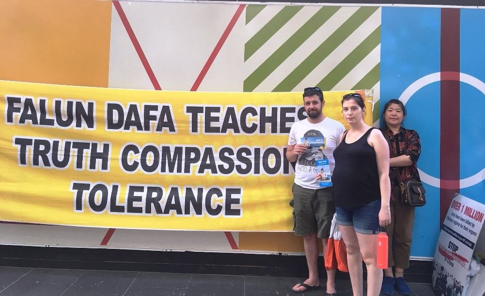 原籍爱尔兰的墨尔本居民、大学生罗南(Ronan)和护士妻子玛丽娅(Maria)被优美的乐声、祥和的功法吸引而好奇地询问,于是法轮功学员详细讲述了法轮功是什么、一九九九年开始遭受中共群体灭绝式的迫害,甚至被活摘器官,仅仅是为了坚守对真善忍的信仰;而中国大陆和海外的法轮功学员为了中国和世界民众不被中共的谎言所欺骗,坚持以各种方式引起世人的关注、了解真相,包括新年前夜向墨尔本的民众和游客送上祝福。