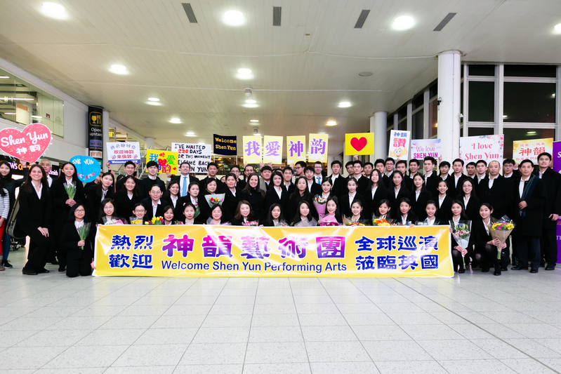 图1:二零一九年一月七日,神韵国际艺术团飞抵伦敦时,在伦敦国际机场受到粉丝们的热情欢迎。