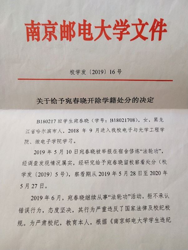 二零一九年五月十二日宛春晓被学校保卫处高压威胁、恐吓。当时有四个人,其中有一个叫陈鹏,是治安科的,在电脑打字做笔录;还有一个叫殷云林,是保卫处处长。宛春晓坚持对他们说,法轮大法是正法。五月十三日,宛春晓被迫违心的写了所谓“保证书”。他们还搜走了她的大法书和资料,交给了南京仙林派出所徐静。五月二十八日,南京邮电大学对宛春晓做出“留校察看”一年的处分。