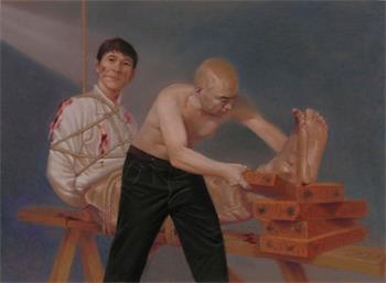 大渡口陈局长、国保支队队长文方火和主任华勇都来“审讯”过,得不到所要的结果,就由办案的几个恶警拳打脚踢,任意折磨我。王东陵用塑料袋拧成绳索,一端系在手铐上,拉着另一端往一边用力拽,疼得我的手腕几乎失去知觉,王却说:“我们是虐待狂,你是被虐待狂,我们就是要这样虐待你。”刘光静坐在椅子上用力蹬钢条壁,钢条壁来回弹动,猛烈的撞击我的尾骨、背部和头部,尤其是铐着的手腕象秋千一样荡着,皮快被勒破了,疼痛难忍。刘还恶狠狠的说:“我们是警官,让你也久关,多做你几年,关死你。”