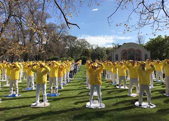 - 观墨尔本市中心晨炼 市民感佩 华人三退- 碧绿如茵的草地上,来自澳洲各地的法轮功学员们优美祥和的五套功法,让很多匆匆而过的路人停下脚步,主动上前询问。