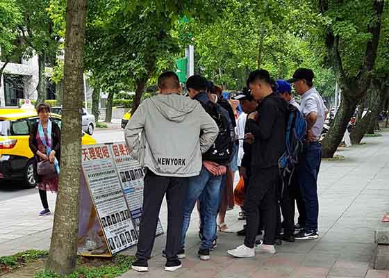 - 在台湾国父纪念馆园区讲真相(图)- 十月十日是中华民国国庆,在台北国父纪念馆的园区内,从十月十日起陆续有各种庆祝活动,法轮功学员也一如既往地在这里摆放真相展位,向民众弘法。