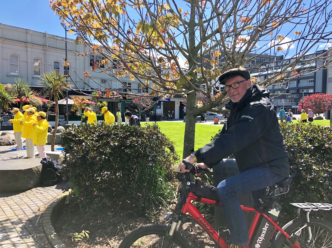 希德(Sid)是一位发型师,他骑车路过,停下来观看功法展示。他表示:“能在这里看到法轮功学员炼功非常棒,我希望人们能支持他们,来学炼法轮功。”他说:“法轮功静功让人感觉非常祥和、独特。”他认为这个世界需要“真、善、忍”这样的价值观。当听到法轮功学员遭受中共迫害的经历时,他表示,希望更多的人了解法轮功是什么,以及法轮功学员被中共活摘器官等真相。他说,新西兰政府应呼吁本国民众不要前往中国做器官移植手术。