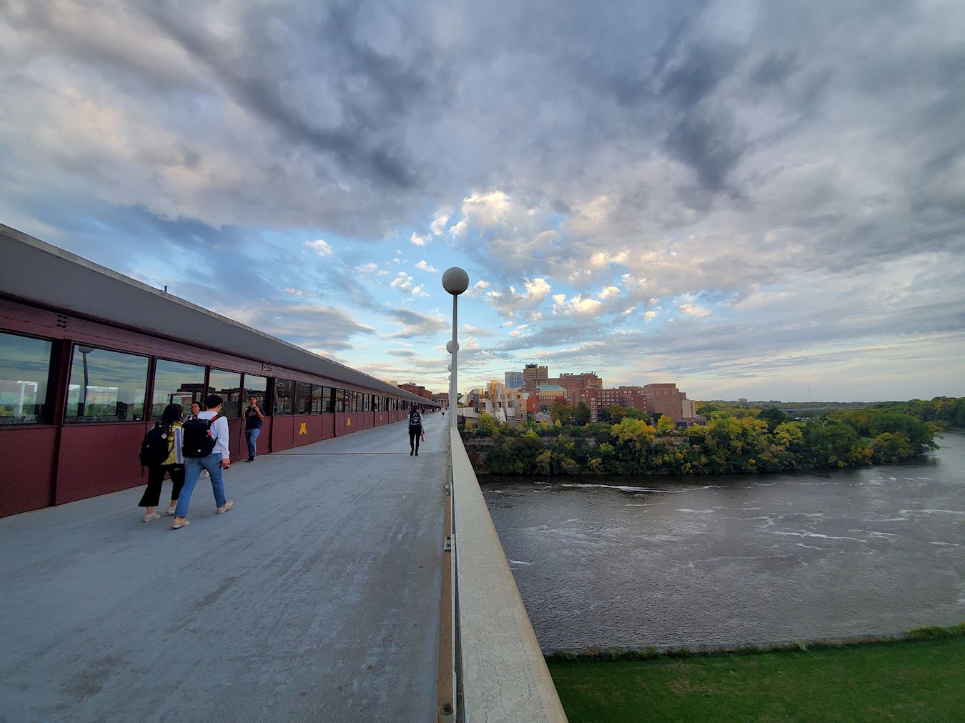 图1:华盛顿大桥(Washington Avenue Bridge)连接着明尼苏达大学被密西西比河分为东岸(East Bank)和西岸(West Bank)的两个校区。