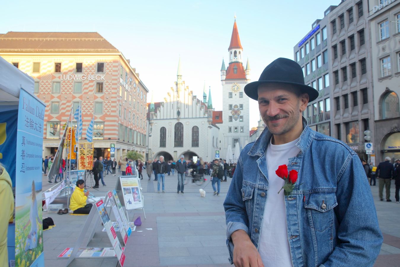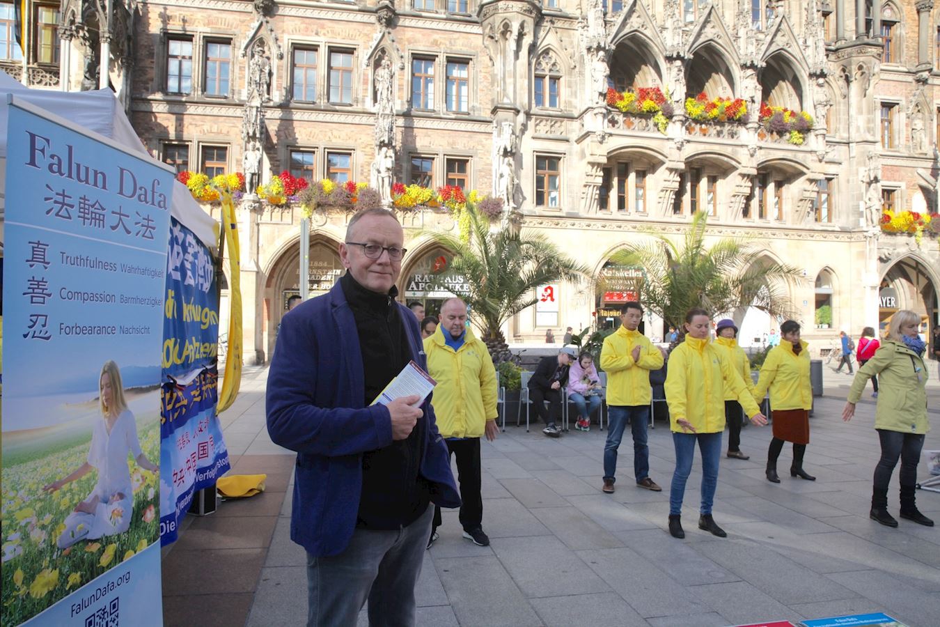 图11:十月三日,教师本哈德·皮力茨Bernhard Pilz先生在慕尼黑玛琳广场看到法轮功学员炼功,感到非常平和。